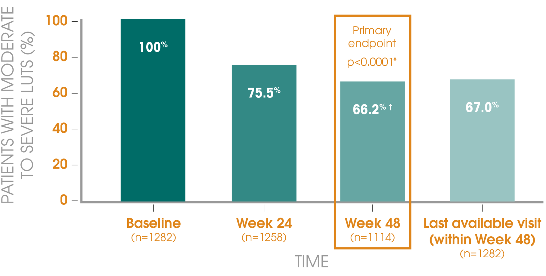 Primary endpoint: The primary efficacy endpoint was the proportion of patients with moderate or severe LUTS after 48 weeks, as assessed by the International Prostate Symptom Score (IPSS). Secondary endpoints included the distribution of IPSS categories, total IPSS and prostate-specific antigen (PSA) levels at baseline, 24 and 48 weeks.