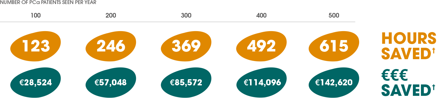 †Hours saved calculations: 73.8 mins x 100 patients / 60 mins = 123 hours; 73.8 mins x 200 patients / 60 mins = 246 hours; 73.8 mins x 300 patients / 60 mins = 369 hours; 73.8 mins x 400 patients / 60 mins = 492 hours; 73.8 mins x 500 patients / 60 mins = 615 hours. €€€ saved calculations: £249.14 x 100 patients = £24,914; £249.14 x 200 patients = £49828; £249.14 x 300 patients = £74,742; £249.14 x 400 patients = £99,656; £249.14 x 500 patients = £124,570. The cost saving of £249.14 per patient per year was reported in the DESERVE study. The output of cost saved calculations reported in this figure was converted from pound sterling to euro. The currency conversion calculations were based on the closing exchange rate of 1 GBP = 1.1449 EUR,11 reported on the publication date of the DESERVE study (5th November 2018).