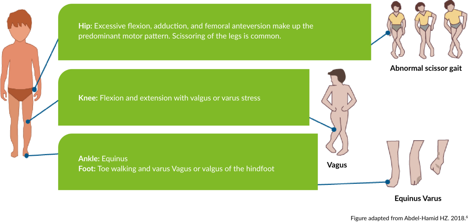 Lower limb involvement leads to a tendency for the hips to be flexed and adducted with the knees flexed and in valgus, and the ankles in equinus, resulting in toe walking.6