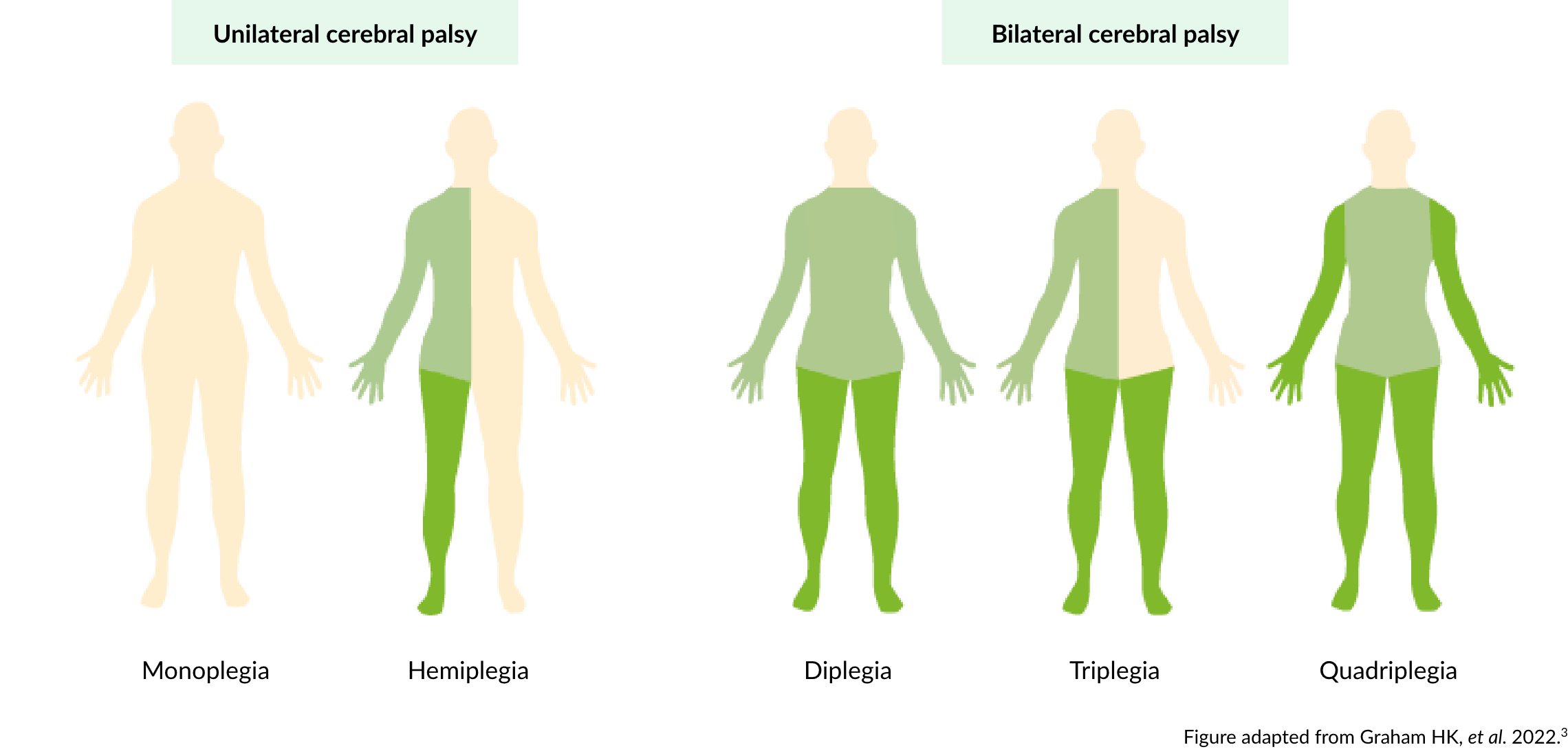 In monoplegia, the one limb affected is more often the lower limb.3 In hemiplegia, one side of the body is affected, and the upper limb is usually more involved than the lower limb.3 In diplegia, all limbs are affected, but the lower limbs are much more affected than the upper limbs.3 Triplegia usually has unilateral upper limb and bilateral (asymmetrical) lower limb involvement. In quadriplegia, the whole body is involved.3